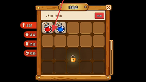 3、道具收集:通過“收集盒”分類管理(外觀、技能、寵物),完成任務(wù)、探索獲取新道具(紅藍(lán)藥水等)。