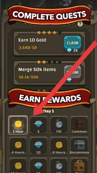 2、進(jìn)入任務(wù)界面,點(diǎn)擊箭頭指向的“1-Hour”獎勵欄,領(lǐng)取對應(yīng)獎勵,助力完成“COMPLETE-QUESTS”任務(wù)。