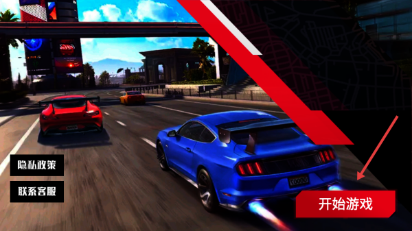 1、點(diǎn)擊【開始游戲】,進(jìn)入城市競(jìng)速場(chǎng)景,藍(lán)、紅、橙賽車同場(chǎng),跳轉(zhuǎn)賽道選擇界面,準(zhǔn)備自定義山谷賽事參數(shù)。