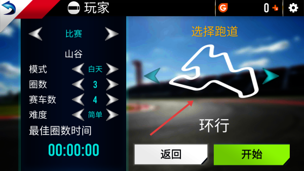 2、在賽道頁(yè),設(shè)定【山谷】(白天、3圈、4車、簡(jiǎn)單難度),選定環(huán)形跑道,點(diǎn)擊【開始】,正式投身山谷競(jìng)速對(duì)決。