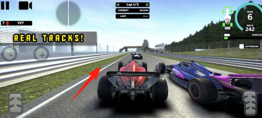 1、在賽道比賽中,駕駛紅色賽車(chē),沿【箭頭】方向,找準(zhǔn)時(shí)機(jī)超越前方紫色賽車(chē)。