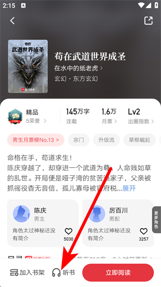 2、在書籍詳情頁面,點(diǎn)擊聽書按鈕,進(jìn)入聽書界面。