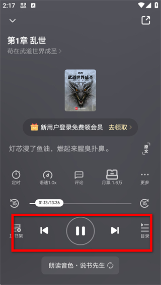 3、在聽書界面,可通過播放控制區(qū)域的按鈕,進(jìn)行聽書操作。