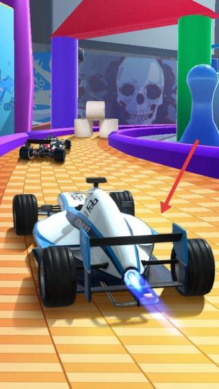 2、進入彩色場景賽道,操控白藍賽車,避骷髏裝飾等障礙,利用直道加速,縮小與前車距離,找時機超車。