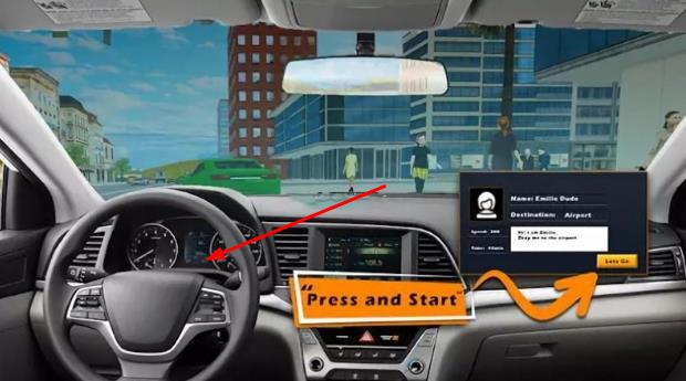 2、進入車內(nèi)駕駛視角,點擊“Press and Start”,依據(jù)乘客目的地提示,通過操控方向盤、擋位等虛擬按鍵,規(guī)劃路線并安全駕駛。