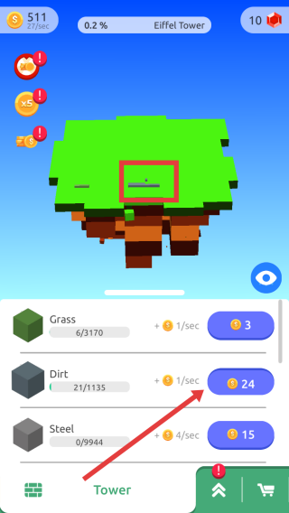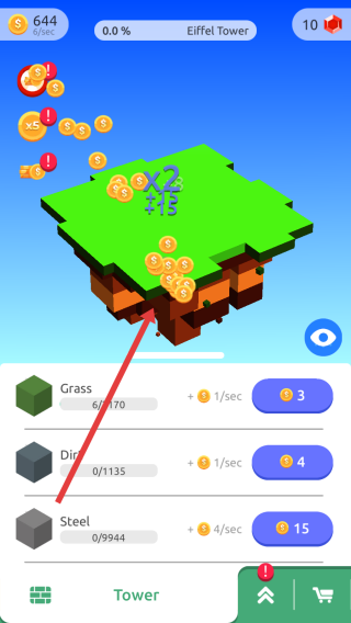 1、初始界面點擊金幣掉落區(qū)域(箭頭指向),快速收集金幣,用于解鎖/升級資源(如Grass、Dirt),推進“Eiffel-Tower”建造。