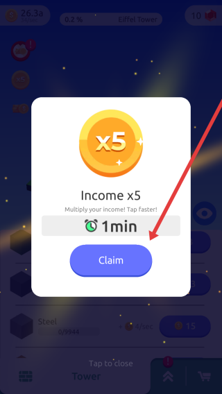3、彈出“Income-x5”界面時,點擊【Claim】(箭頭指向),獲取1分鐘金幣收益翻倍效果,快速積累財富,升級更多資源。