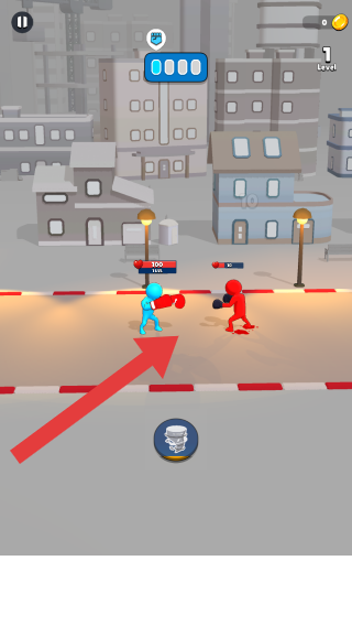 2、畫面中藍色角色和紅色角色正在城市街道場景中進行拳擊對戰(zhàn),左上角有暫停按鈕,右上角顯示關(guān)卡為1級,還有金幣數(shù)量,藍色角色上方有血量條顯示為100。