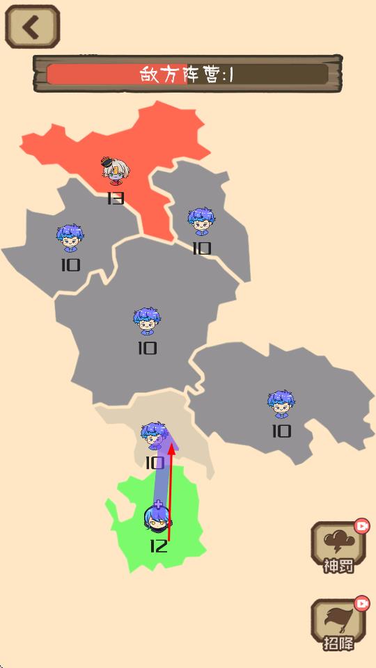 1、“陣營擴張”,在地圖界面,調(diào)配兵力(數(shù)值12、10等),進攻敵方陣營(紅色區(qū)域),占領(lǐng)領(lǐng)土。