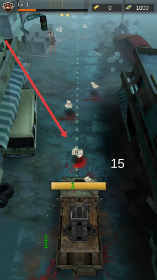 2、移動階段,沿箭頭指引方向,駕駛載具或徒步前進(jìn),拾取道路上的物資(如紙張、金幣),避開僵尸群。