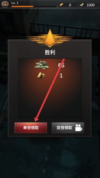 3、勝利結(jié)算后,點擊“單倍領(lǐng)取”(箭頭指向),獲取金幣、金條獎勵,繼續(xù)下一關(guān)挑戰(zhàn)。