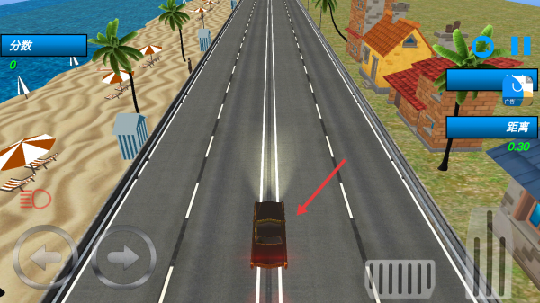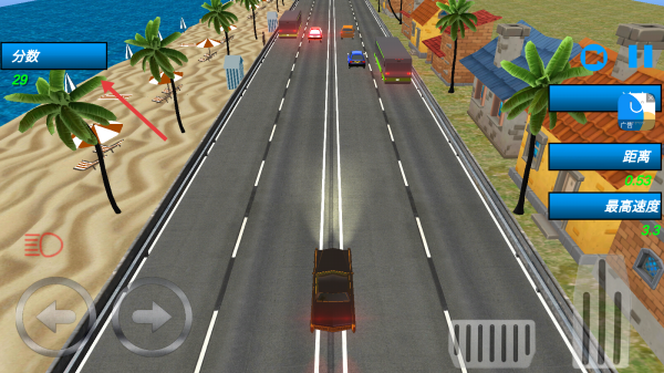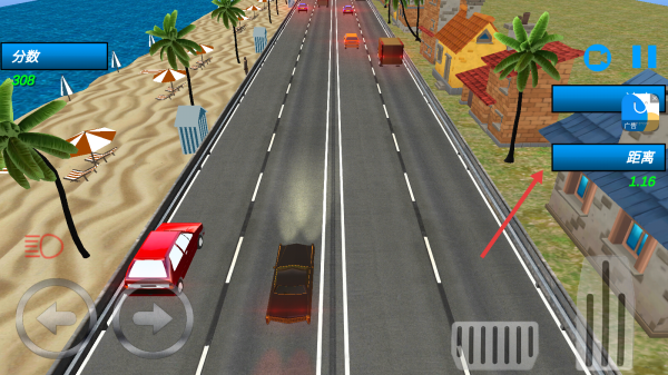 1、駕駛黑色轎車在海濱公路行駛,用左右按鍵控方向,避障礙,留意“分?jǐn)?shù)”“距離”等數(shù)據(jù)。