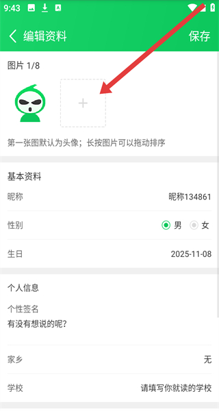 4、在編輯資料頁面中,可以點(diǎn)擊圖片右側(cè)+按鈕,進(jìn)行添加圖片作為頭像進(jìn)行更換。