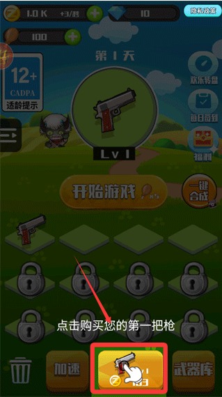 1、開始游戲后首先點(diǎn)擊購(gòu)買我們的第一把槍。