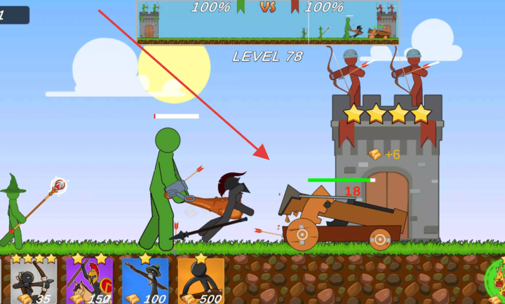 2、LEVEL78面對(duì)敵方城堡,派投石車(箭頭指向)轟城墻,巫師輔助控場(chǎng),前排肉盾抗箭,推進(jìn)至摧毀建筑。