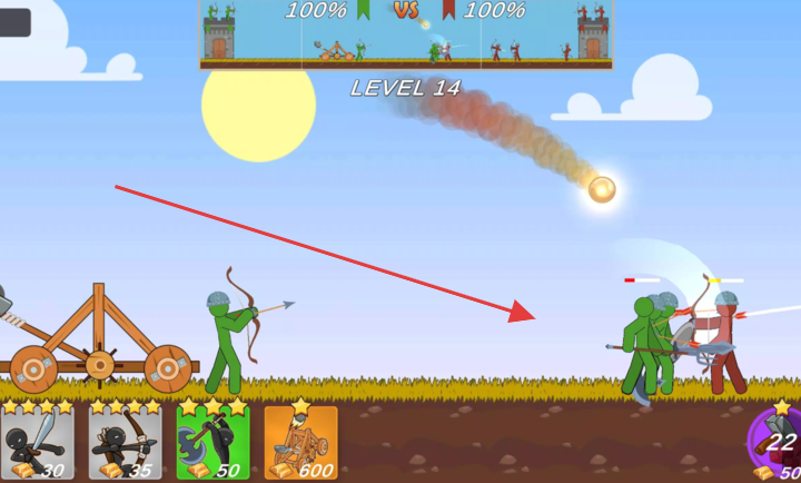 1、在LEVEL14,派弓箭手遠(yuǎn)程攻擊,利用投石車(箭頭指向)砸敵方單位,優(yōu)先清前排,推進(jìn)戰(zhàn)線。