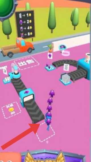 2、畫(huà)面中能看到紫色角色、傳送帶、出售標(biāo)識(shí)等游戲元素,還有增加數(shù)值的提示牌。