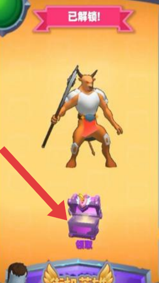 3、顯示已解鎖一個(gè)持長(zhǎng)矛的牛頭人角色,下方有個(gè)紫色箱子,箭頭指向它,箱子下有“領(lǐng)取”字樣。