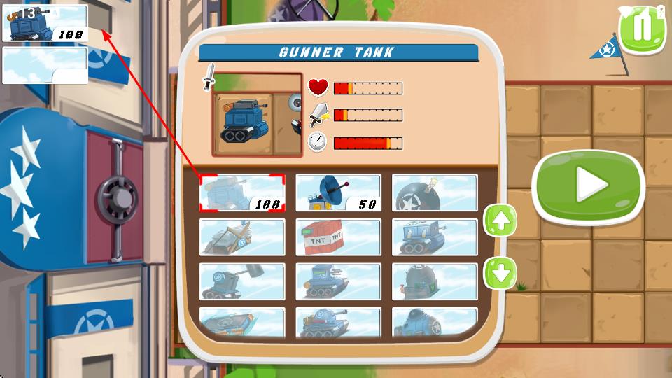 1、在坦克選擇界面,挑選坦克,消耗金幣將其部署到戰(zhàn)場方格,構建防御進攻陣型。