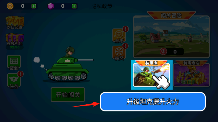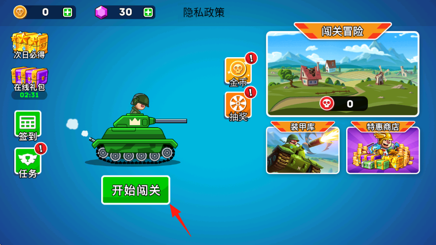 1、進(jìn)入游戲主界面,看到綠色坦克與多樣功能入口(簽到、任務(wù)等),點(diǎn)擊“開始闖關(guān)”,駕駛坦克投身冒險(xiǎn),可先利用左側(cè)“任務(wù)”“簽到”積累資源(金幣、抽獎(jiǎng)次數(shù))。