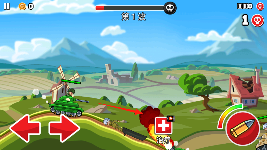 3、進(jìn)入闖關(guān)戰(zhàn)斗,操控綠色坦克在地形(山坡、草地)行駛,應(yīng)對(duì)第1波敵人,通過左右箭頭控制移動(dòng),點(diǎn)擊子彈按鈕射擊,遇到受傷友軍可釋放“治療”救援。