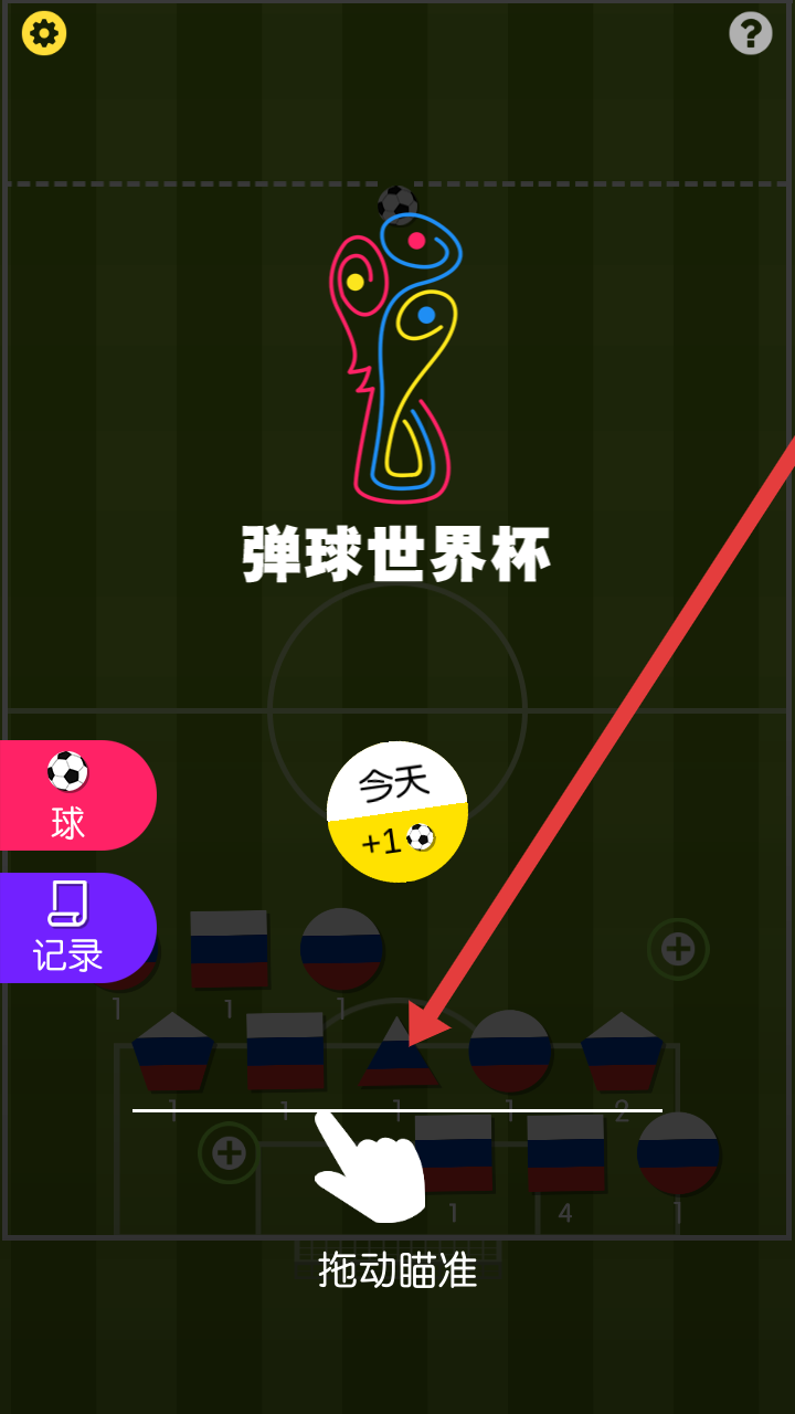 1、進(jìn)入彈球世界杯的游戲主界面后,操控者需要點(diǎn)擊拖動足球瞄準(zhǔn),發(fā)射開啟彈射消除挑戰(zhàn)。