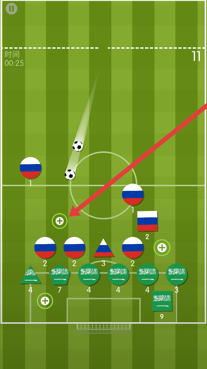 2、在彈球世界杯游戲中,需要操控足球彈射,碰撞帶俄羅斯國旗的圖形,利用彈射機(jī)制消除目標(biāo)積累分?jǐn)?shù)。