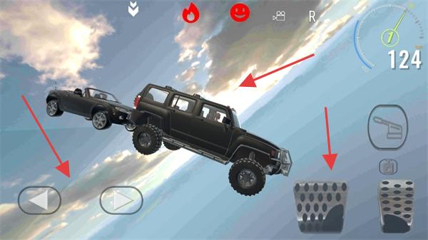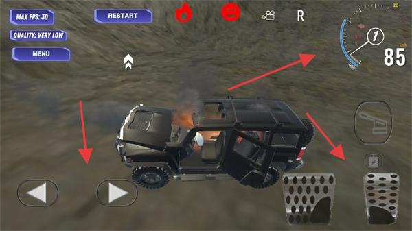 2、在駕駛界面(第二、三張圖 ),用左右箭頭按鈕控制方向,下方踏板控制加速 / 剎車,駕駛汽車完成特技、越野等挑戰(zhàn),留意速度表、車輛狀態(tài)(著火等)。