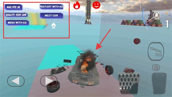 1、進(jìn)入游戲,若車輛損毀(如首圖著火狀態(tài) ),可點 “RESTART WITH AD(看廣告重開)”“NEXT CAR(換車)”“MENU WITH AD(看廣告回主菜單)” 重新開始。