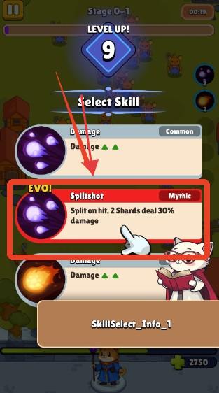 1、“技能選擇”,角色升級(jí)(LEVELUP)時(shí),挑選技能(Splitshot),強(qiáng)化戰(zhàn)斗能力,適配關(guān)卡(Stage0-1)。
