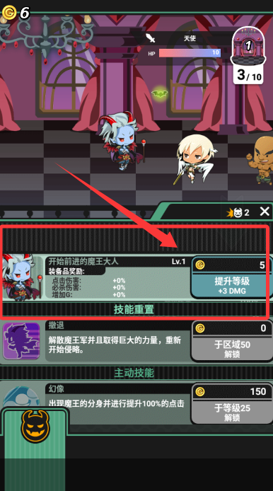 2、戰(zhàn)勝野外魔物獲取大量金幣,用于強(qiáng)化魔王屬性與解鎖強(qiáng)力技能。