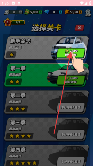 3、在“選擇關(guān)卡”界面,點(diǎn)擊“新手關(guān)卡最高出現(xiàn)”旁的“2000前往收車”,消耗金幣解鎖,開始首個收車任務(wù),積累資源升級。