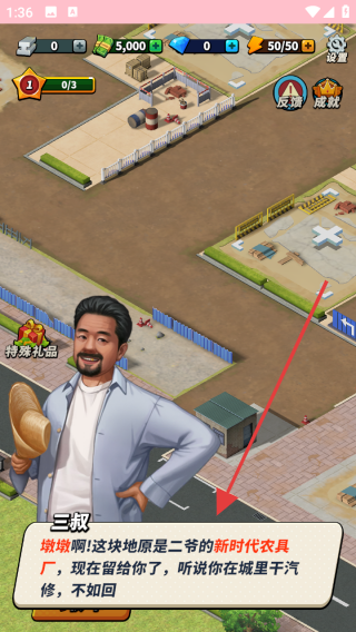 2、跟隨“三叔”對話指引,了解初始場景(原新時代農(nóng)具廠),接收基礎(chǔ)任務(wù)與場地,熟悉游戲背景和目標(biāo)。