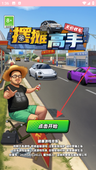1、點(diǎn)擊主界面“點(diǎn)擊開始”按鈕,進(jìn)入游戲,開啟擺攤收車的經(jīng)營之旅。
