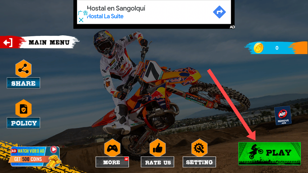 1、進(jìn)入游戲主界面,點擊“PLAY”開啟摩托車越野挑戰(zhàn),可選擇觀看廣告獲取金幣,或直接進(jìn)入賽事,借“PLAY”按鈕觸發(fā)核心玩法,體驗?zāi)ν熊囋揭暗拇碳ぁ?