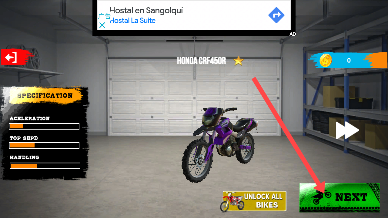 2、在車庫選車界面,查看紫色摩托車屬性(加速、極速等),點擊“NEXT”進(jìn)入賽事準(zhǔn)備,可解鎖全部車輛,借車輛選擇機制,為越野挑戰(zhàn)匹配合適摩托。