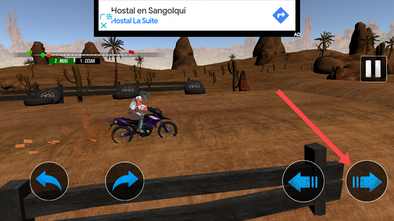 3、進(jìn)入沙漠越野場景,操控紫色摩托車,利用左右箭頭按鍵轉(zhuǎn)彎、加速,跨越障礙,與對手競速,通過虛擬按鍵控制摩托,在沙漠地形中比拼技巧。