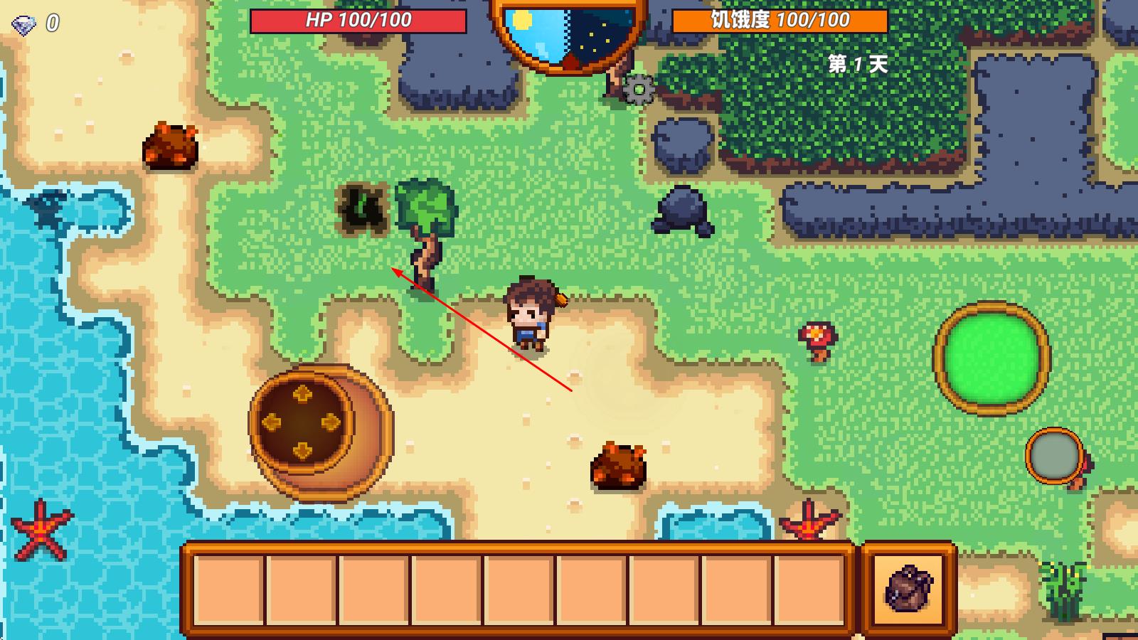 1、進(jìn)入像素世界,初始降臨小島,需快速收集木材、石頭等基礎(chǔ)資源,搭建簡(jiǎn)易庇護(hù)所,同時(shí)關(guān)注饑餓值,尋找食物維持生存。