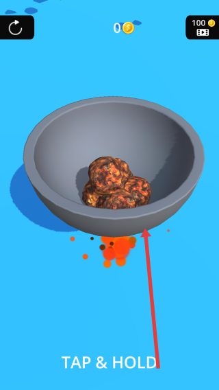 3、進入烹飪環(huán)節(jié),將合成后的食材放入碗中,按提示“TAP&HOLD”操作,完成烹飪,獲取游戲獎勵。