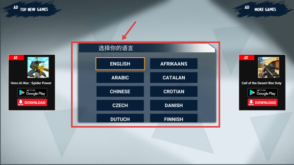 1、語言設(shè)置:開局選“CHINESE”等語言,調(diào)整游戲顯示語種。