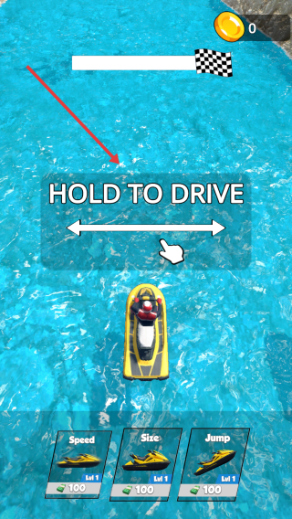 1、長按屏幕【HOLD TO DRIVE】區(qū)域,控制黃色摩托艇啟動,開啟水上競速挑戰(zhàn)。