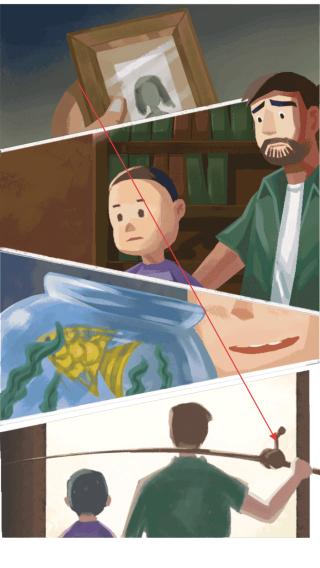 1、瀏覽劇情插畫,了解父子與金魚的故事,點擊進入釣魚場景開啟游戲,沉浸式享受游玩樂趣。