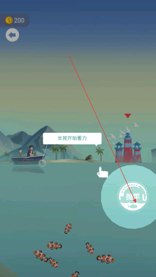 2、長按【拋竿】按鈕蓄力,松開將釣線拋出,盡量對準魚群密集區(qū)域,等待魚咬鉤。
