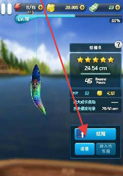 2、釣到紅鯉魚等魚類后,查看長(zhǎng)度、星級(jí)等屬性,可選擇【炫耀】分享成果,或【放入水族館】留存,積攢資源。