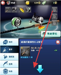 3、進(jìn)入【我的背包】,用金幣升級(jí)“破璃纖維釣竿-X新手”等漁具,提升耐久、釣力,挑戰(zhàn)高階漁場(chǎng),釣稀有魚。