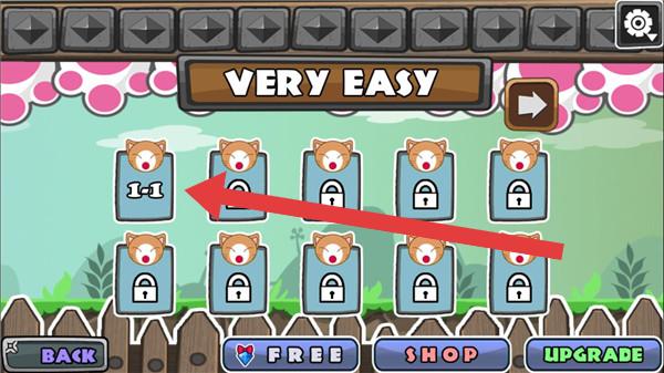 1、點(diǎn)擊【TAP-TO-START】,進(jìn)入《Cat-War》,選擇“VERY-EASY”難度的“1-1”關(guān)卡,開啟貓咪戰(zhàn)斗。