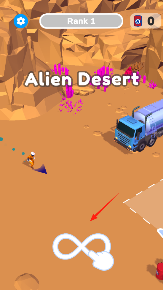 1、進(jìn)入“Alien Desert”場景,點(diǎn)擊地面的無限符號(hào)圖標(biāo),操控角色移動(dòng),借符號(hào)交互機(jī)制,規(guī)劃行進(jìn)路線,在沙漠環(huán)境探索,體驗(yàn)開放世界的移動(dòng)玩法,感受地形與操作結(jié)合的樂趣。