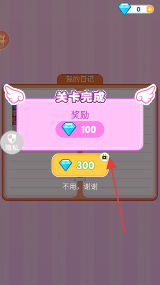 3、完成關卡任務后,會彈出獎勵界面,點擊箭頭指向的獎勵區(qū)域(如300鉆石),領取鉆石等獎勵,用于解鎖更多服裝和道具,提升游戲體驗。