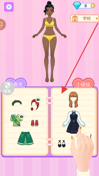 2、在換裝界面,參考“小娃娃”分類(箭頭指向),從提供的服裝、配飾中選擇合適的搭配給角色穿上,如選擇黑色連衣裙等,可前往“學?!钡葓鼍罢故敬钆洹?