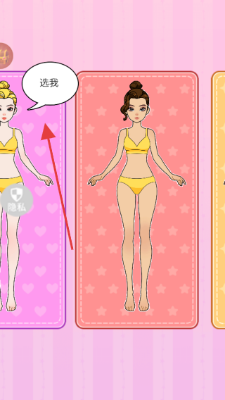 1、根據箭頭指示,點擊選擇穿著黃色比基尼、帶有“選我”氣泡的角色,進入換裝環(huán)節(jié)。